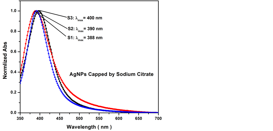 Figure 2 shows the absorption spectra of the AgNPs in the wavelength range of 350 - 700 nm. A sharp peak is seen at the wavelengths; 388 nm, 390 nm and 400 nm for samples S1, S2 and S3, respectively. Due to the quantum size effect, the band shifted to higher wavelengths as the size of the nanoparticles increased. These bands are assigned to the surface plasmon bands that correspond to the completely or roughly spherical shape of the AgNPs. These bands express a collective oscillation frequency for the electrons in the conduction band. The electrons correlated to these sizes of AgNPs are much smaller than the incident wavelength. In this case, the electric field induced by light (Eo) is constant and the electrons submit to the electromagnetic field and propagate like a plasmon wave [32] . Considering that the atoms’ nuclei are still, the oscillation of the electrons leads
