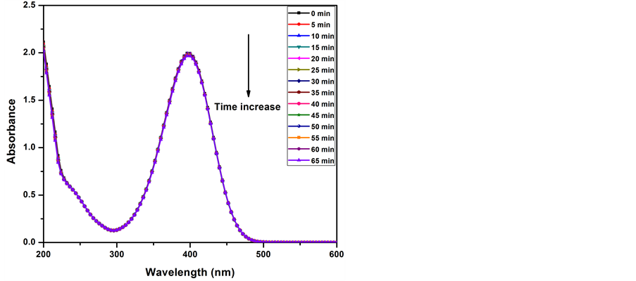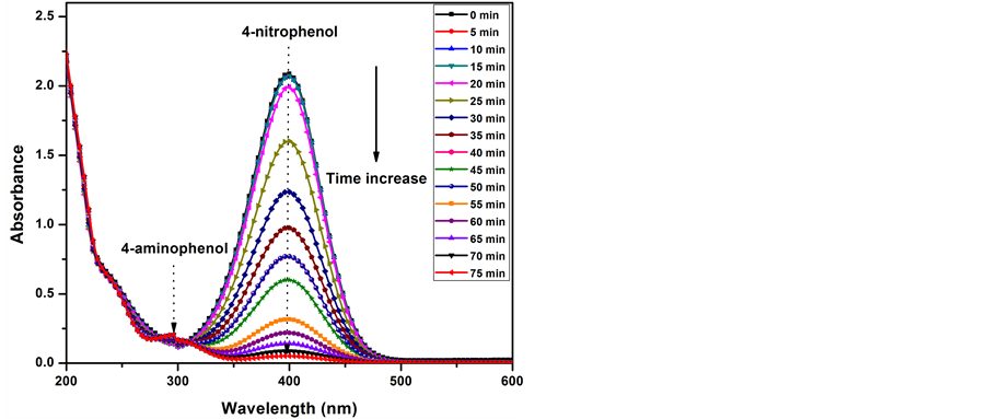 Figure 4 shows the UV-VIS spectra of the 4-NP (2 mmol) with and without NaBH4. One band appeared at 317 nm in the 4-NP spectrum. This band is characterized as the electronic transition n-π*, owing to the lone pair of electrons (oxygen and nitrogen atoms) in the 4-NP structure. This peak shifted to a higher wavelength at 400 nm after the addition of 0.03 M of NaBH4. The solution colour transformed from light yellow to yellow-green. This peak corresponds to the formation of 4-NP ions. This band decreased slightly with increased reduction time and became stable after 45 min without change. This result is in agreement with the previous work by Seoudi et al. [33] and Rashid et al. (2006) [34] .