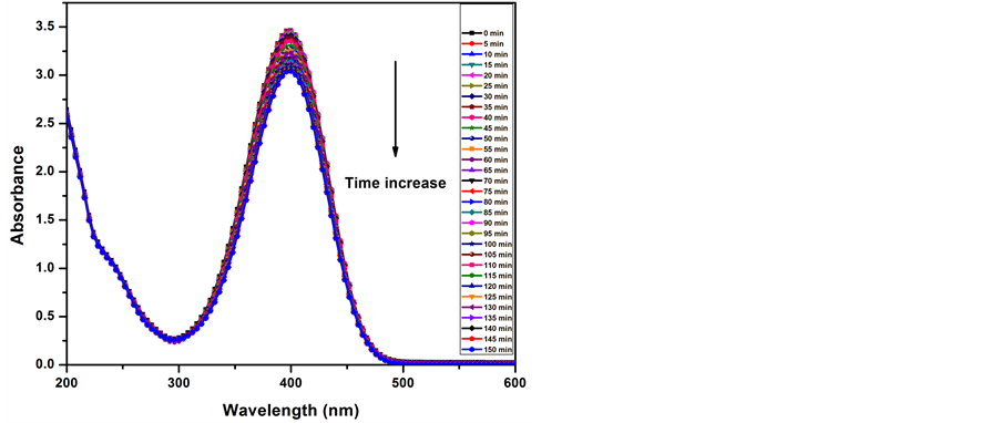 As shown in Figure 5, The catalytic activity of AgNPs of 9 nm (S1), 11 nm (S2) and 14 nm (S3) in diameter was analysed by measuring the UV-VIS spectrum of 4-NP in the range of 200 - 600 nm at various times in the presence of NaBH4.It is clear that the reduction in the band that appeared at 400 nm for each sample increased depending on the size of the nanoparticles. For S1, the band reduction was measured after 5 min. Usually, this time is ascribed to the diffusion time needed for adsorption of 4-NP onto the surface of the AgNPs. In addition, as mall, new band appeared at about 290 nm. The decrease in the intensity of the band at 400 nm may be due to decreased 4-NP concentration, and the new band at 290 nm may be due to the formation of aminophenol (AP). The appearance of the latter can be explained as follows: NaBH4 reduces water to hydrogen as