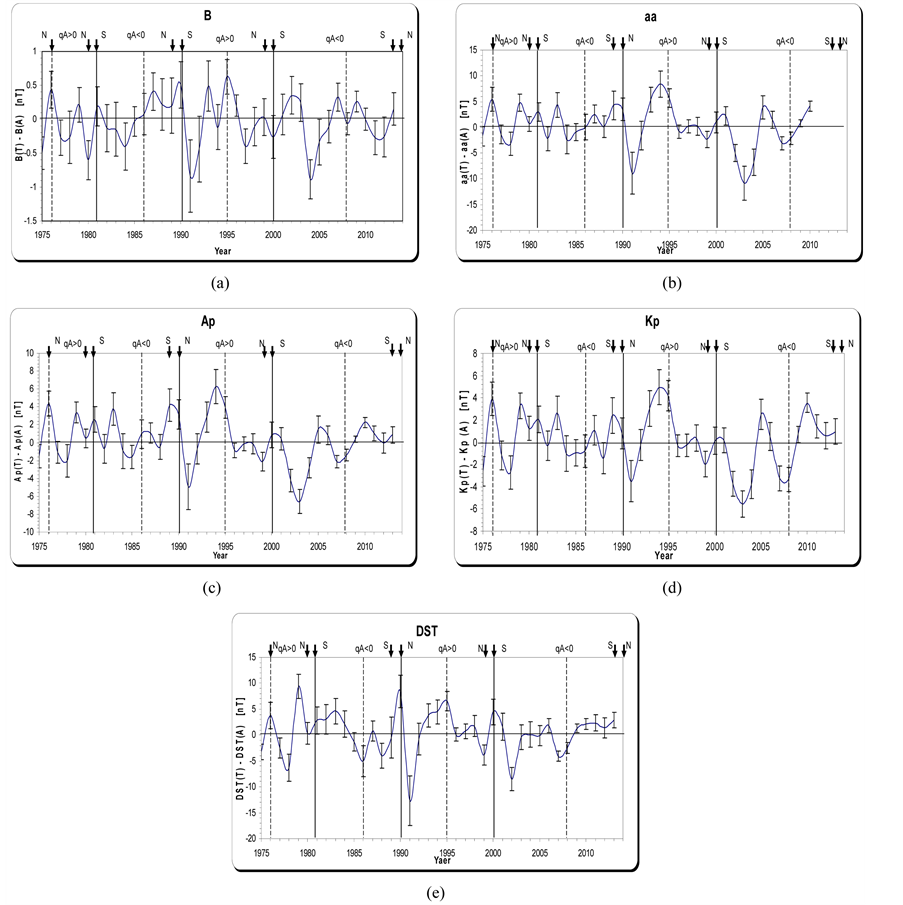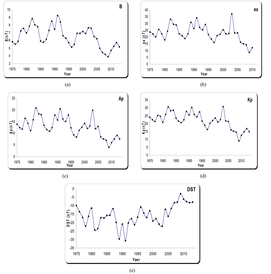 Figure 1 represents the time series of the annual averages for the field magnitude (B) and the geomagnetic indices (aa, Ap, Kp, and DST). The behavior of the field magnitude B (plot 1a) is nearly the same to the behavior of the geomagnetic parameters aa, Ap, and Kp (plot 1b to 1d). They have higher peaks on (1982, 1989, and 1991) years, beside that (aa, Ap, and Kp) have a another higher peak on 2003. Plots (1a to 1d) have an irregular pattern and two maxima are observed (double peak modulation), one near the maximum solar activity period and the other in the descending phase [20] [21] . It is believed that the first peak is caused by coronal mass ejections, whereas the second peak is caused by geomagnetic disturbances due to the coronal-hole fast streams, which are more frequent in this part of each solar cycle [22] . In some cycles they have three peaks structure, the first peak before or in solar maximum and the other two in the descending phase of solar activity cycle. From the other side the Disturbance Storm-Time Index DST (plot 1e) reflects an opposite behavior for the field magnitude (B) and the geomagnetic index (aa, Ap, and Kp) where its values have been in negative (i.e., the reference level for the DST is set to be statistically zero on internationally designated quiet days and −50 nT or deeper to indicate a storm-level disturbance). So it can explain what happen in years (1989 and 1991) where DST has a higher negative value than the other parameters.