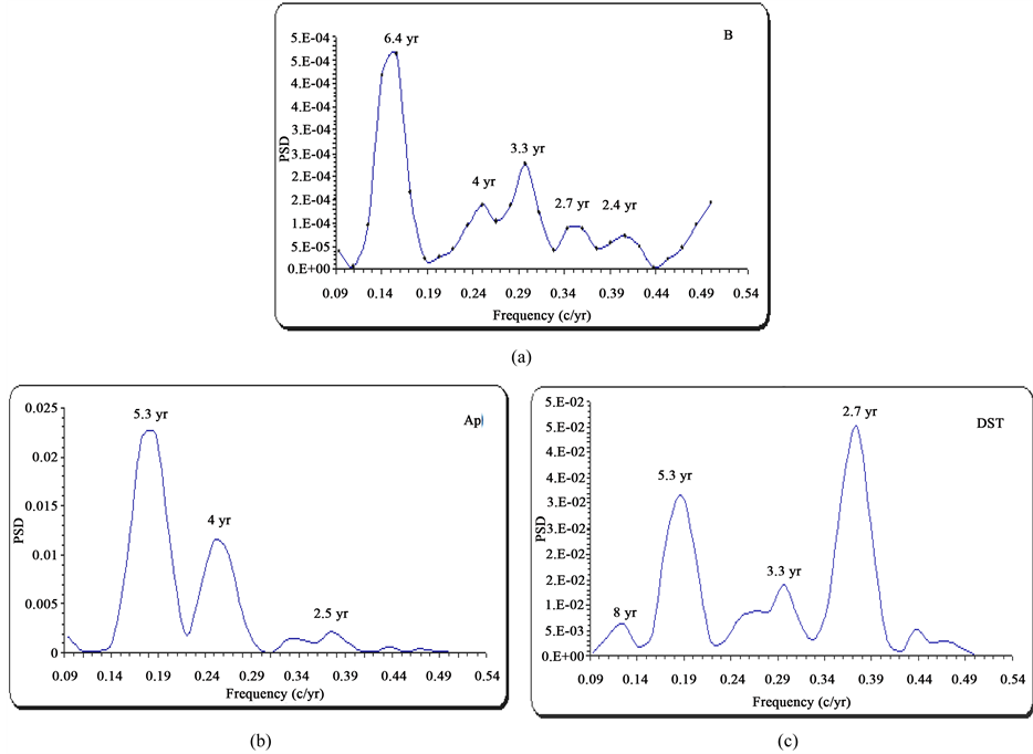 Figure 3 displays the PSD of the asymmetry for the IMF, Ap, and DST for the period from (1975-2013). The spectrum of the asymmetry for the field magnitude B shows significant peaks at (6.4, 4, 3.3, 2.7 and 2.4 years) as shown in plot 3a. Whereas, plot 3b displays significant peaks at wave-lengths 5.3, 4, and 2.5 years for the asymmetry of the geomagnetic index Ap. Furthermore, the PSD of the DST index shows significant peaks at 8, 5.3, 3.3, and 2.7 years. From the other hand, the PSD of the asymmetry for the geomagnetic index aa, and Kp gives the same peaks that observed on the geomagnetic index Ap, for this reason aa and Kp are missing from the PSD analysis. The plots confirmed similar or identical fluctuations of the 5.3 - 6.4, 4, 3.3 and 2.5 - 27 years between the considered parameters. The 5.3 - 6.4 yr variation found in the considered parameters may be attributed to the different path of ion particles in heliosphere [23] . The 4 years, may be caused by the dual peak structure of geomagnetic activity or it is caused by a sector boundary of crossings [24] . A simple explanation for the peak at 8 year that appeared in the spectrum of DST index with lower magnitude is that it may be related to the formation rate and the magnetic structure of achieving regions in the solar southern hemisphere [25] . Finally it is obvious that the N-S asymmetry is appeared for the considered parameters, and the main periodicity of the asymmetry does not coincide with the 10.7 year solar cycle. But the main periodicity of the asymmetry may be the periodicity at the 5.0, 4.0 and 3.3 years that were founded in the considered parameters.