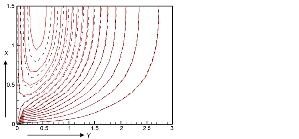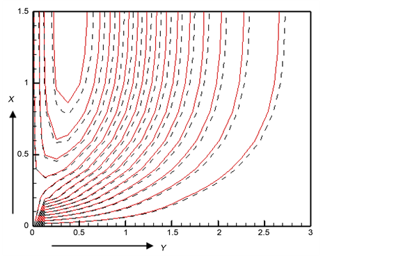boundary layer increases and thermal boundary layer decreases owing to the increase of electrical conductivity parameter ε. Figure 27 and Figure 28 delimitate the significant effect of radiation absorption parameter Q1 on streamlines and isotherms.