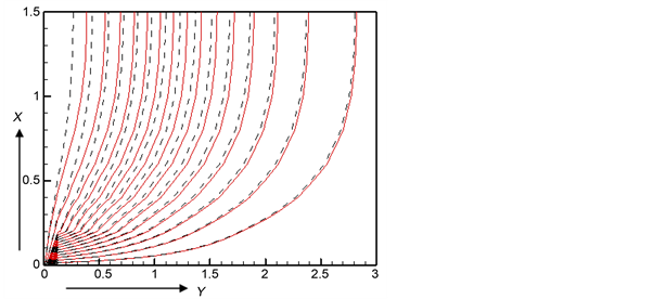 Figure 25. Streamlines for ε = 0 (red solid line) and ε = 0.75 (black dashed line).