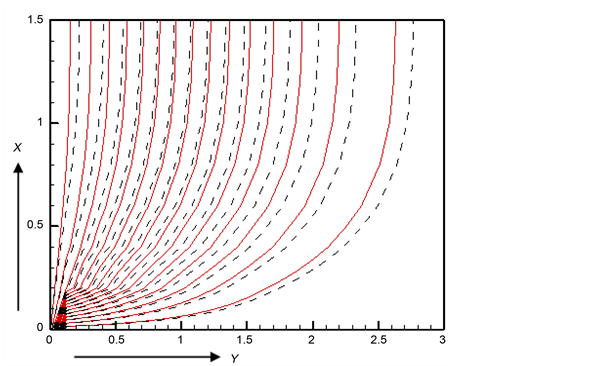 The present problem has required a set of finite difference equations. In this process the region within the boundary layer is divided into grid or meshes of lines parallel to X and Y coordinates where X-axis is considered along the plate and Y-axis is perpendicular to the plate. Here the plate of height is taken Xmax (=20) i.e. X varies from 0 to 20 and as corresponds to Ymax (=25) i.e. Y varies from 0 to 25. Grid spacing in the X and Y direction are mmax = 100 and nmax = respectively. ∆X and ∆Y are constant mesh size along X and Y directions as follows