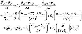 The free convection problem in the presence of high-speed magnetic field has enormous industrial applications such as welding, the safety aspect of gas-cooled reactors, solar energy collectors, crystal growth, materials processing and cooling reactors. Desale and Pradhan [15] have used implicit finite difference technique to obtain the solution of MHD boundary layer heat transfer over a moving plate. Mishra and Jena [16] have used Runge-Kutta fourth-order algorithm to calculate the numerical results of boundary layer MHD flow with viscous dissipation and the computations have been done by a computational computer language, MATLAB. Haque and Sarder [17] have imposed explicit finite difference scheme to complete the investigation of convective heat and mass transfer of high-speed MHD flow over a stretching sheet with the influence of thermal diffusion. Haque and Sarder [17] have also discussed the stability criteria of the explicit finite difference method in a nutshell. From the experiments of Desale and Pradhan [15] , Mishra and Jena [16] and Haque and Sarder [17] , it is observed that temperature enhances in the presence of high-speed MHD.