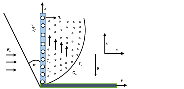Consider an unsteady two-dimensional laminar free convective flow past a porous plate, which is embedded in an incompressible viscous fluid having temperature dependent electrical conductivity. The fluid is taken to be a gray, absorbing emitting radiation but not scattering the medium. The plate is inclined to the vertical direction by an angle φ. The x-axis is directed along the plate in the direction of the fluid and y-axis is considered normal to the plate in the fluid. At first, it is taken that the plate and the fluid are of the same temperature T∞ with concentration level C∞ at all points. At time t > 0, the plate is exponentially accelerated in its own plane with a velocity Uoexp(a*t). At the same time, the temperature of the plate and the concentration level are also decreased or increased exponentially with respect to time t. It is considered that a radiative heat flux qr is employed in the perpendicular direction to the plate. It is also considered that a higher order chemical reaction taking place between the fluid and the diffusing species. A transverse magnetic field of fixed magnitude Bo is employed perpendicular to the direction of the flow. It is considered that the induced magnetic field is insignificant in comparison to the employed magnetic field. The physical diagram of the problem is elucidated in Figure 1.