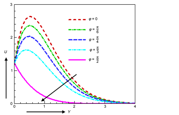 Figure 2 delineates the effect of angle of inclination φ on fluid flow. Velocity decreases with the increasing values of inclination angle because the magnitude of the buoyancy force decreases with an increase in the inclination angle. Pattnaik et al. [27] are computed the same result.