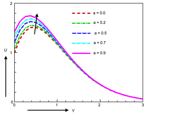 Figure 3 demonstrates the impact of acceleration parameter a on the velocity field. It is evident that the velocity increases near the plate and remains same far away from the plate with the increase of acceleration parameter a. The same result has already been deliberated by Pattnaik et al. [27] .