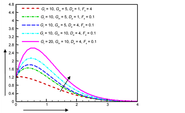Figure 4. Velocity profile for various values of Gr, Gm, Da and Fs.