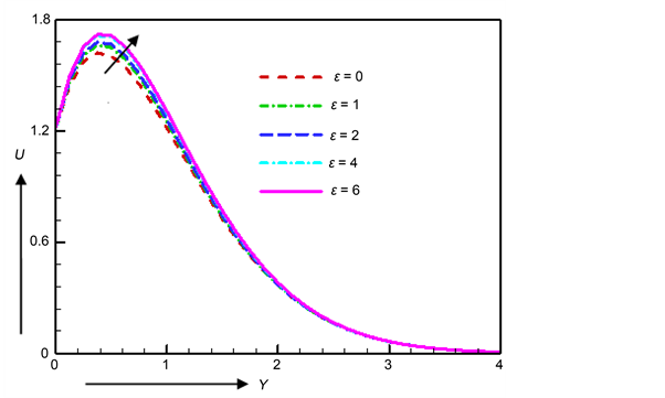 well as local skin friction increase due to the increase of electrical conductivity parameter ε. A similar result has been noticed by Shrama and Singh [28] . At Y = 0.375, the values of velocities are computed numerically as 1.62184, 1.6639, 1.68, 1.71604 and 1.72238 for electrical conductivity parameter ε = 0, 1, 2, 4 and 6 respectively. Here it is noticed that the maximum velocity increases by 4.206% as