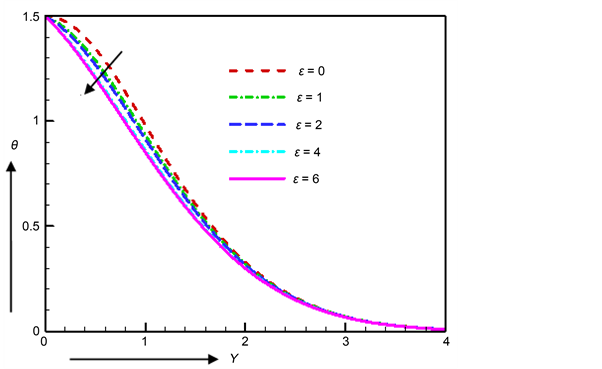 the electrical conductivity parameter ε change from 0 to 1. The values of temperature are given as 1.34834, 1.29251, 1.26982, 1.216 and 1.20606 for electrical conductivity parameter ε = 0, 1, 2, 4 and 6 respectively which take place at same position Y = 0.5 and the maximum temperature increases by 5.584% as the change of ε = 0 to ε = 1. Electrical conductivity parameter ε generates the