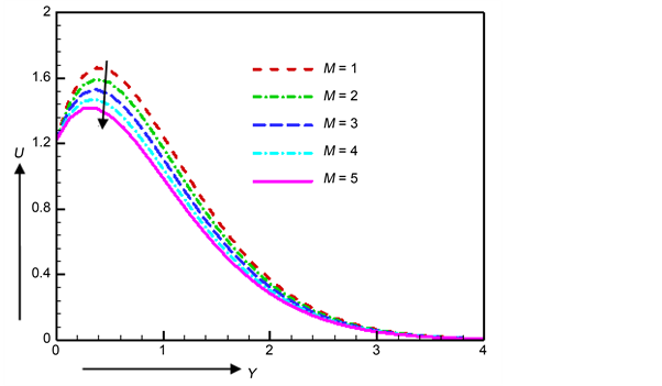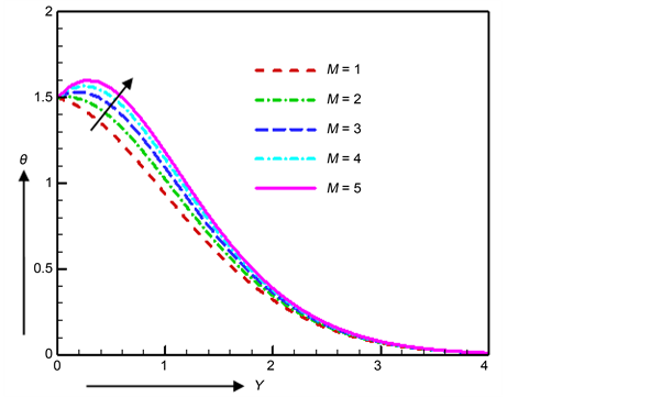 transfer. The same type of result for velocity and temperature has already been illustrated by Desale and Pradhan [15] and Haque and Sarder [17] . At Y = 0.5, the values of temperature are filed as 1.29251, 1.59486, 1.53073, 1.47086 and 1.41475 for the difference values of magnetic parameter M as 1, 2, 3, 4 and 5 respectively. Here we observed that the maximum temperature increases by 8.855% as for the change of the magnetic parameter M from 1 to 2 at the same point Y = 0.5.