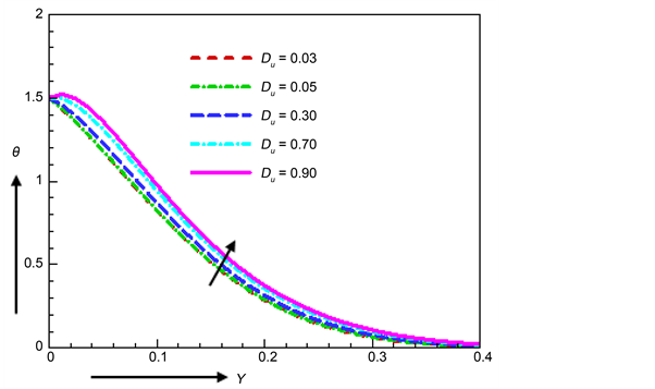 The influence of Dufour number Du number on temperature profile is delineated in Figure 16. The energy flux generated by concentration gradient re- presents the Dufour Effect. From Figure 16, it is clearly seen that temperature increase owing to the increase of Dufour number Du.