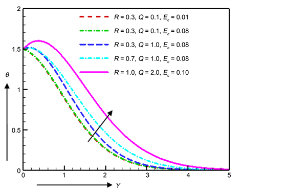 The impacts of radiation parameter R, heat source parameter Q and Eckert number Ec on temperature are depicted in Figure 17. Thermal boundary layer thickness increases with the increase in thermal radiation parameter R. It is noticed that an increase in heat generation parameter increases the thermal boundary layer thickness. This is owing to the fact that heat source can add more heat to the plate which increases its temperature. The Eckert number enunciates the ratio of the kinetic energy in the flow and the enthalpy. The positive Eckert number corresponds to the cooling plate i.e., the fluid can take heat from the plate. The thermal buoyancy force increases with the increase of radiation parameter R, heat source parameter Q and Eckert number Ec that means the rate of heat difference between the plate and the fluid decreases.
