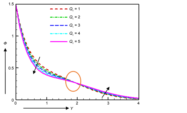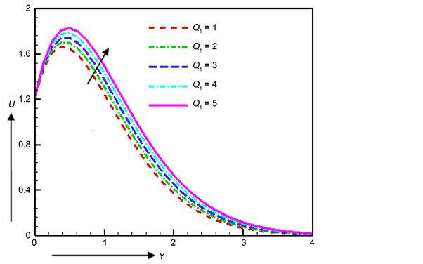 The effect of radiation absorption parameter Q1 on velocity, temperature, concentration, Nusselt number and Sherwood number is illustrated in Figures 18-22. At the position of Y = 0.5 the values of velocity are recorded as 1.65010, 1.69753, 1.74318, 1.78711 and 1.82938 for radiation absorption parameter Q1 = 1, 2, 3, 4 and 5 respectively. From Figure 18 it is clearly observed that the maximum velocity increases by 4.828% for the change of radiation absorption parameter Q1 from 4 to 5 which happen at same point Y = 0.5. The temperatures are computed as 0.9352, 1.04030, 1.14076, 1.23672 and 1.32832 at Y = 1.0 for radiation absorption parameter Q1 = 1, 2, 3, 4 and 5 respectively and the maximum temperature increases by 10.51%. In Figure 20 the concentration increases by 2.977%, 2.847%, 2.723% and 2.601% as the changes of radiation absorption parameter Q1 as follows 1 to 2, 2 to 3, 3 to 4 and 4 to 5 which occur at Y = 0.75. The coefficients of Nusselt number decrease due to the increase of radiation absorption parameter. At the time τ = 0.397 the coefficients of Nusselt number are recorded as 0.04451, −0.02754, −0.09647, −0.16243 and −0.22556 for radiation absorption parameter Q1 = 1, 2, 3, 4 and 5 respectively. Here we saw that the Nusselt number decreases with the increasing values of radiation absorption parameter Q1. This result is similar with Vedavathi et al. [12] , Prakash et al. [13] and Umamaheswar et al. [14] .