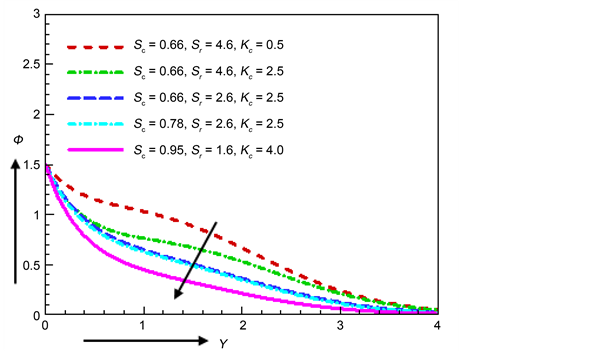 Figure 23 shows the concentration profile for various values of Schmidt number Sc, Soret number Sr and chemical reaction parameter Kc. Physically the rise of Schmidt number Sc means a decrease of molecular diffusivity, which results in a decrease of the species boundary layer. The mass flux generated by temperature gradient is designate as the Soret effect. The concentration profile increases with the increasing vales of Soret number Sr. An increase in the chemical reaction parameter Kc leads to the downfall of the concentration.