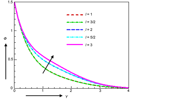 The effect of higher order chemical reaction l on concentration profile is delimitated in Figure 24. From the Figure 24, it is seen that the concentration increases with increase of the order of chemical reaction l. The similar result is shown by Alam and Ahammad [32] .