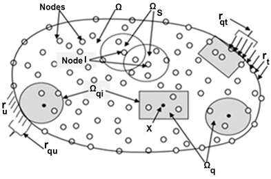 The MLPG (meshless local Petrov-Galerkin) method constructs the weak form over local subdomain such as , which is a small region taken for each node inside the global domain. The local subdomains overlap, and cover the whole global domain . In the present paper, the local subdomains are taken to be of a quadrature shape. The local weak form [20] [21] of the governing Equation (25) can be written as: