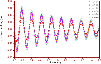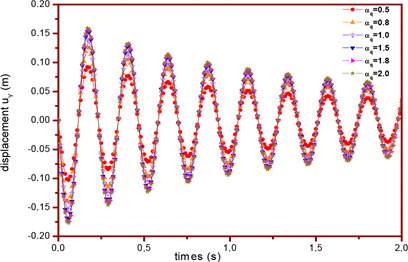 Figure 4. Displacements uy at the middle point B at the free end of the plate excited by the time-step load for different values of where and .