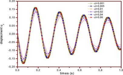 Figure 6. The time variation of displacements in the y direction at the point B with different time steps using the fixed values .