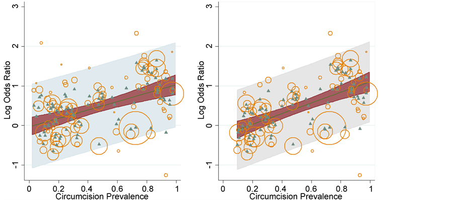 Figure 1. Meta-regression analysis of log odds of HIV infection between uncircumcised and circumcised men using a single covariate (MC prevalence) in the meta-regression model performed using the metareg package in STATA 13. The plot fits the regression line, with circles representing the estimates from each study, sized according to the precision of each estimate [122] . We have plotted these for all countries (a) and data for Africa only (b), using correct data (see supplementary table in Morris et al. [2] which shows correct values for studies used by Van Howe [3] in his meta-regression analysis). We did not have raw data (or accurate data or data that we could be certain were included in Van Howe’s original analysis), which is why we used n = 103, rather than the n = 109 studies used by Van Howe.