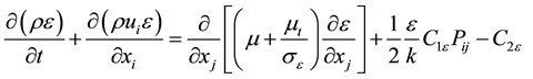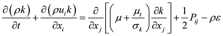 For the second-order model (RSM) used in this work, the turbulent kinetic energy and its dissipation rate are given by the system of equations as follows: