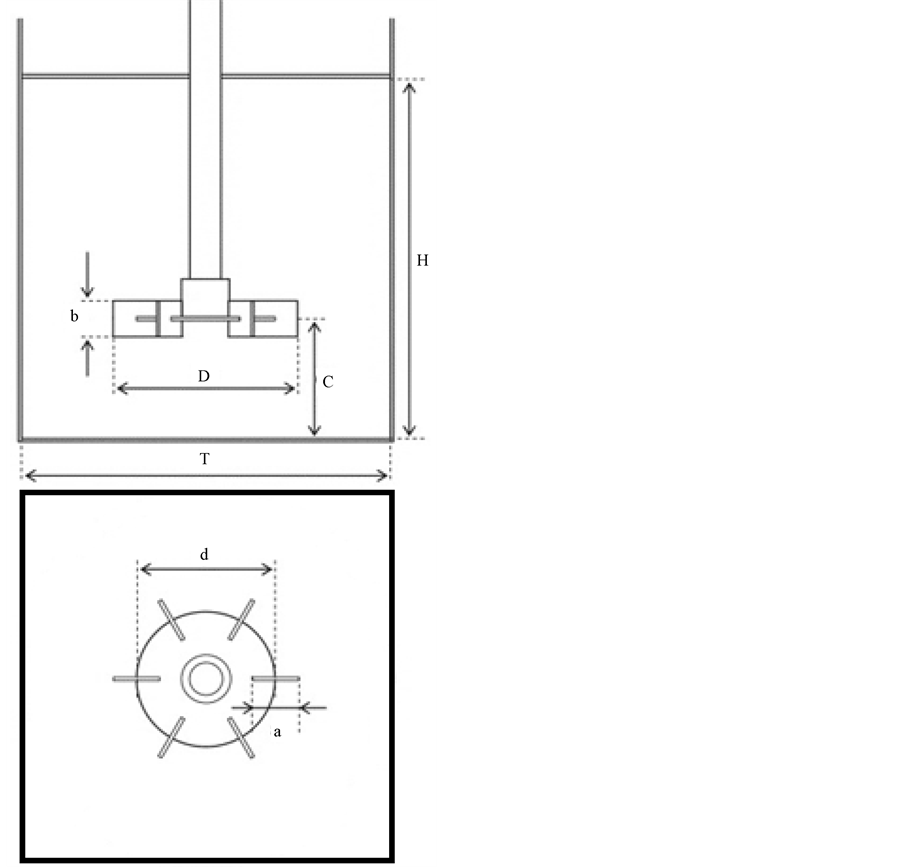 and was stirred by a Rushton turbine. The number of blade was six. The disk mounted impeller 0.095 m in di- ameter (D/T = 0.5), with standard proportions between parts (a = D/4, b = D/5, d = 3/4D. The impeller is installed along the axis of the tank with a shaft diameter of ds = 0.001 m and an off-bottom clearance of C = T/3. The vessel was 0.19 m tall (H = T) and was provided with a flat lid that inhibited the central vortex formation as well as any surface aeration. The tank was filled with pure water at room temperature. The rotational speed of the impeller N was 200 rpm (3.33 rps), resulting in a Reynolds number of about 4.2 × 104. In the numerical si- mulations, the fluid was assumed to be incompressible, isothermal and Newtonian with a density of 1000 kg∙m−3 and a dynamic viscosity of 1 × 10−3 Ns∙m−2.
