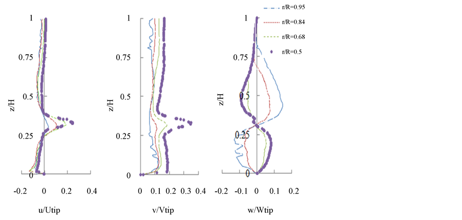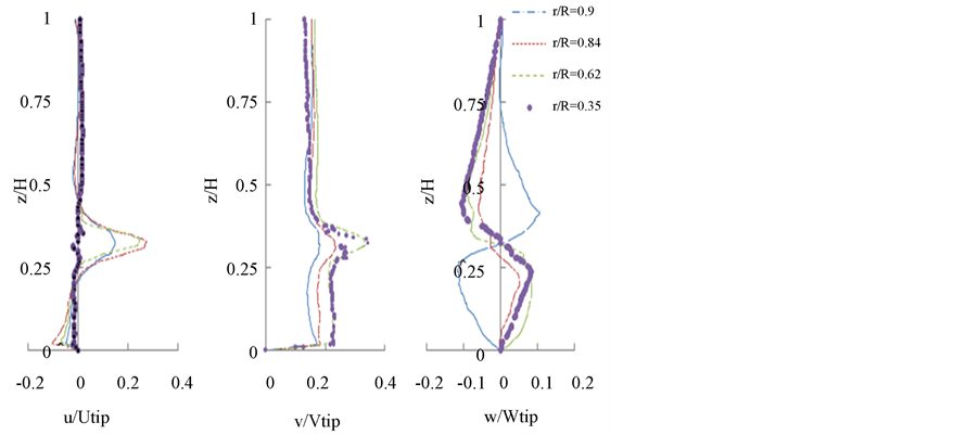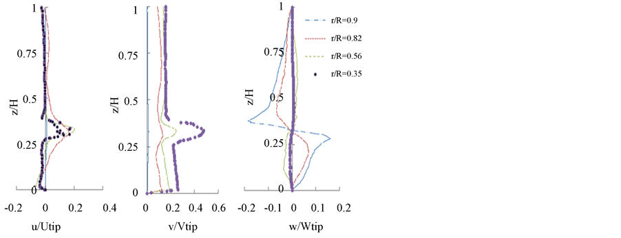 nent is characterized by a value of velocity v/vtip = 0.2 which remains constant on both sides of the turbine. In the area swept by the impeller the tangential component presents the maximum value. This maximum is v/vtip = 0.4 at the radial position r/R = 0.62. Figure 14(c) shows the axial component of velocity. We find that the jet axial turbine that powers extends to a radial position r/R = 0.84. Note that for the radial position r/R = 0.9 the jet is weighty in descending lower zone of the tank but the jet ascending in the upper part is small and it’s zero in the axial position between z/H = 0.75 and z/H = 1.