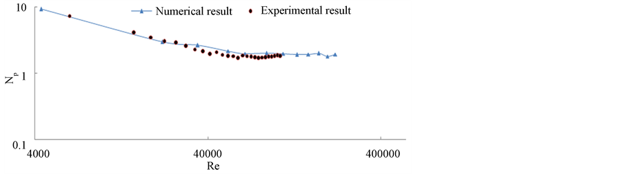 Figure 16. Power number Np against reynolds number Re of rushton turbine in square tank.