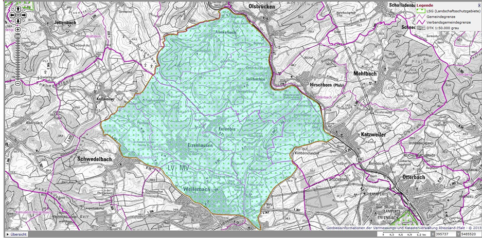 The landscape conservation area Eulenkopf is located in the north-western district of the independent city of Kaiserslautern and extends over an area of 3550 ha, reaching across the districts of the association of munici- palities Weilerbach and Otterbach. The settlements of the municipalities Sulzbach, Frankelbach, Erzenhausen and Eulenbis all lie entirely within the landscape conservation area as Figure 1 shows [19] .