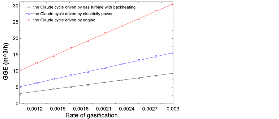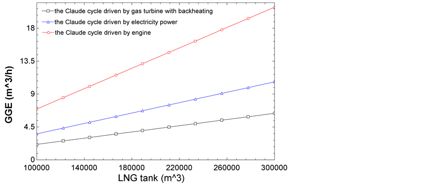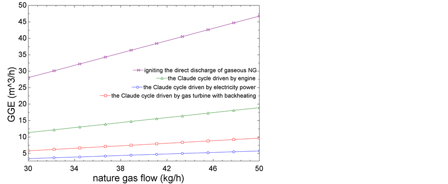3) When gaseous natural gas flow rate is small, the greenhouse gas emissions (GGE) is small; With the increasing of natural gas boil-off gas flow, the greenhouse gas emissions (GGE) of the three systems increases. The GGE from high to low is as follows: the Claude cycle driven by the Internal combustion engine, the Claude cycle driven by the electricity power and the Claude cycle driven by the gas turbine.