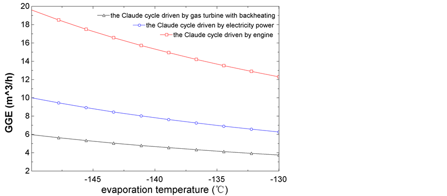 4) In the Claude cycle, with the evaporation temperature increasing, the greenhouse gas emissions (GGE) decreases on the contrary. So in the actual operating system, the evaporation temperature of the Claude cycle should be tried to rise. But with the limit of the liquefied natural gas temperature, the evaporation temperature