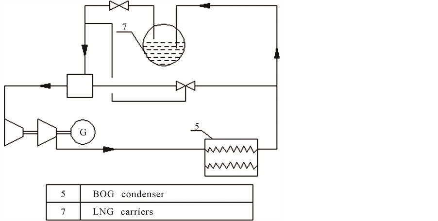 Numerous researches have been conducted to investigate the approaches capable of re-liquefying the BOG to LNG. For example, Baek [10] gives an investigation of novel LNG re-liquefaction process where the cold exergy of sub-cooled LNG is utilized to recondense the vaporized light component of LNG after it is separated from the heavier component in a phase separator. Younggy Shin [11] designs a re-liquefaction process based on the reverse Brayton cycle, and analyzes its static thermodynamic states at the design BOG load. To make the cycle work for any BOG load, an idea was sought that would achieve a heat balance with the work extracted by the expander. Chang Kwang Pil [12] gives an introduction to reliability assessment of re-liquefaction systems for boil-off gas (BOG) on LNG carriers with focus on redundancy optimization and maintenance strategies. Hoseyn Sayyaadi [13] [14] researched that onboard boil-off gas (BOG) re-liquefaction system as a cryogenic refrigeration cycle is utilized in order to re-liquefy the BOG and returns it to the cargo tanks instead of burning it. He also performed the optimization in order to maximize the exergetic efficiency of plant and minimize the unit cost of the system product (refrigeration effect), simultaneously. Thermodynamic modeling is performed based on energy and exergy analyses, while an exergoeconomic model based on the total revenue requirement (TRR) are developed. Javier Romero [15] analyses the Brayton cooling cycle for the reliquefaction of the boil off on liquefied natural gas (LNG) vessels. Above all, there are many kinds of liquefied natural gas: such as Precooled Joule-Thomson (JT) Cycle, Claude cycle, Cascade Cycle, Mixed-Refrigerant Cycle(MRC), Stirling Cycle and so on [16] . BOG of LNG recover technology described above mainly is focus on the coefficient of performance (COP). For using different systems to produce the same cooling capacity which is used to the boil-off gas re-liquefaction, the coefficient of performance each system cannot correctly reflect the real performance of the unit. Using the primary energy ratio to compare four kinds of different boil-off gas re-liquefaction systems will be comparable. No researcher do this analyze on greenhouse gas emissions. So in this paper, in order to find the optimization cycle for BOG re-liquefaction, it is mainly analyzed about three different power input (electricity, gas turbine and internal combustion engine) for Claude Cycle to liquefying natural gas. All the analyses are based on the greenhouse gas emissions (GGE).