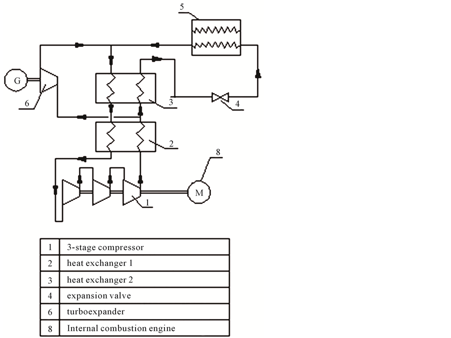 This system is similar to the Claude cycle which is driven by the electricity. The location of the generator is replaced by the internal combustion engine which drives the Claude cycle. The system is shown in Figure 4.