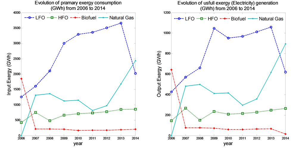 from the expressions of these different forms of exergy. The figure below shows the evolution from 2006 to 2014 of these quantities for each mode of conversion of the primary exergy (LFO thermal power plants to, HFO thermal power plants, biofuel thermal plants and natural gas thermal power plants).