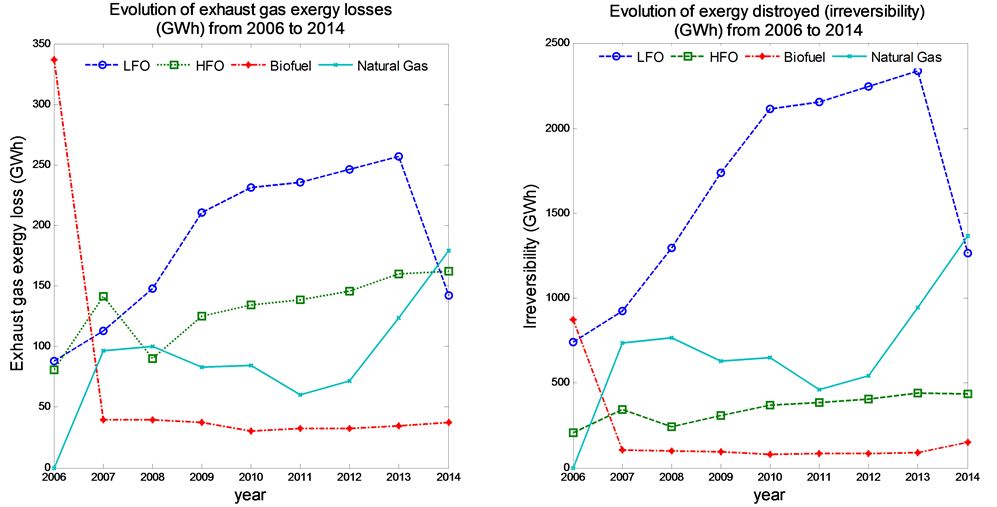 Figure 6. Exergy balance for different conversion technologies: evolution from 2006 to 2014.