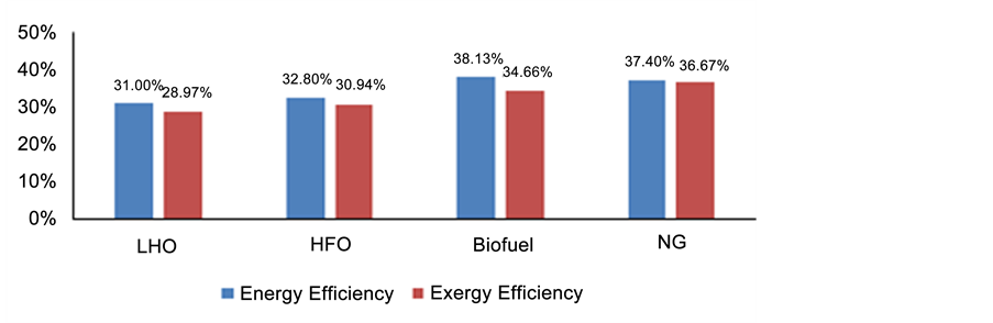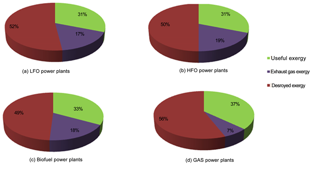The exergy balance in Figure 6 shows that each conversion system makes it possible to obtain four forms of exergy, namely: the input exergy supplied by the fuel, the useful exergy in the formof electricity, the loss of exergy in the exhaust gas and the loss of exergy due to irreversibilities. We evaluated the annual exergy