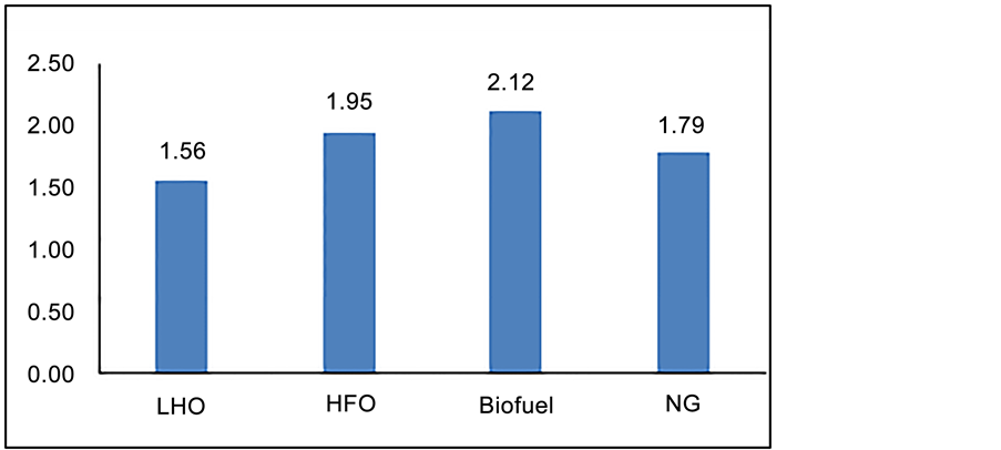 Figure 9 shows the average sustainability indexes of different electricity generation technologies in Cameroon. The sustainability index for biofuel units (renewable) is higher (2.12), followed by units at LFO (1.95), then natural gas units (1.79), and units at HFO (1.56). A high sustainability index reflects a better sustainability of the technology. However, given the characteristics of natural gas, one would have expected a high durability index. Its relative low value is due to