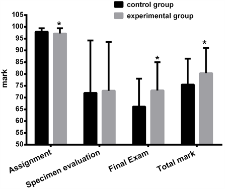 Student achievement included regular assignments (the average of seven assignments), specimen examination, and the final exam (out of 100 points). The total mark of term evaluation = regular assignment × 10% + specimen examination × 20% + final exam × 70% (see Table 2and Figure 3). The results in Table 2showed that the experimental group and the control group were significantly different (P < 0.01) in all results except for the specimen examination results (P > 0.05).