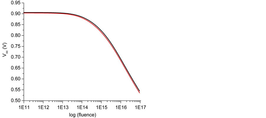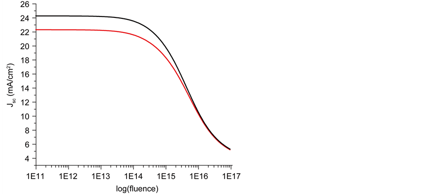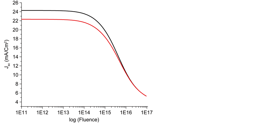 By comparing the irradiation effect on Cell 1 and Cell 2, where the window layer p-AlGaAs on p+/n-GaAs are normal (ξ = 0) and gradual (ξ = −500 V∙Cm−1) respectively, we find that the gradual p-AlGaAs window improves the better resistance to electron irradiation of the short circuit current Jsc for the short fluence. This is more clarified in Figure 3(a) which shows the variation of the short circuit current Jsc versus the fluence of 1 MeV electron irradiation under 1AMO. Also, thanks to the gradual band profile, the internal electric field ξ caused the accelerating photo-generated of the carriers and thereby enhance their collection efficiency; this electrical field helps to reduce the recombination. By contrast, in