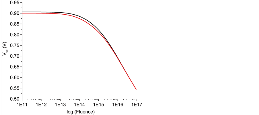 Figure 2. Variation of the short circuit current Jsc (a) and the open circuit voltage Voc (b) under 1 AM0 illumination, versus the fluence of 1 MeV electron irradiation, calculated for both values of