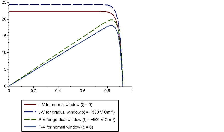 Figure 4. Current density-Voltage (J-V) and Power-Voltage (P-V) characteristics of the illuminated solar cells after irradiation by 1014 cm−2 electron fluence, calculated for both values of ξ = −500 V/Cm and ξ = 0 in p-AlGaAs gradual and normal windows respectively.