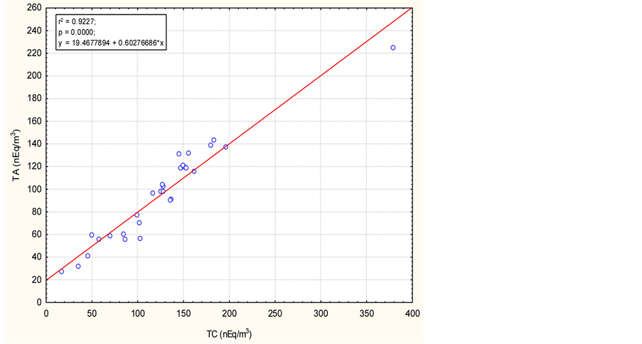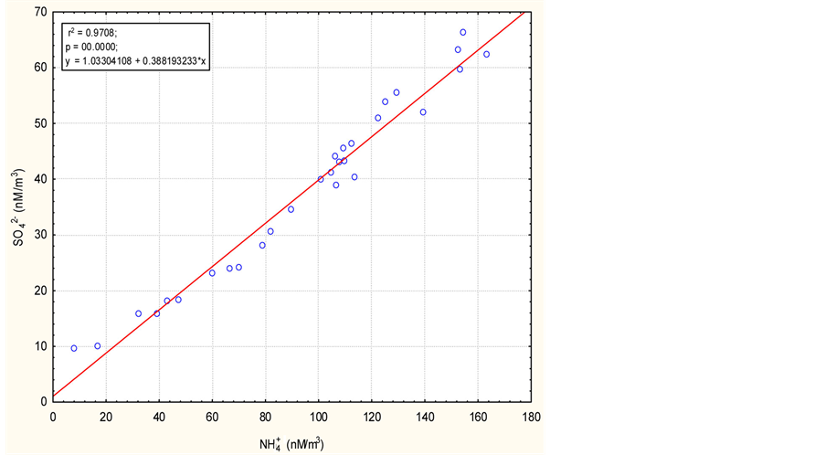 Moreover, a linear regression analysis was performed by the least squares method between the levels of anions and cations concentrations, expressed as nM/m3 (nanomolar per m3). This was done with the intention of evaluating the presence of chemical neutralization processes between these species. From this analysis, those results were taken with values of r > 0.82 between anions and cations. The linear regression analysis suggested