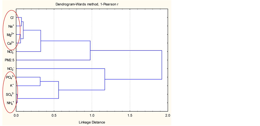 A multivariate analysis Cluster type was performed to the data set of the composition of anions and cations associated with PM2.5. Ward’s method for the formation of groups was applied to standardized variables. The dendrogram allowed for distinguishing two basic groups for integration of anion and cation species (Figure 5). One of them consists primarily of