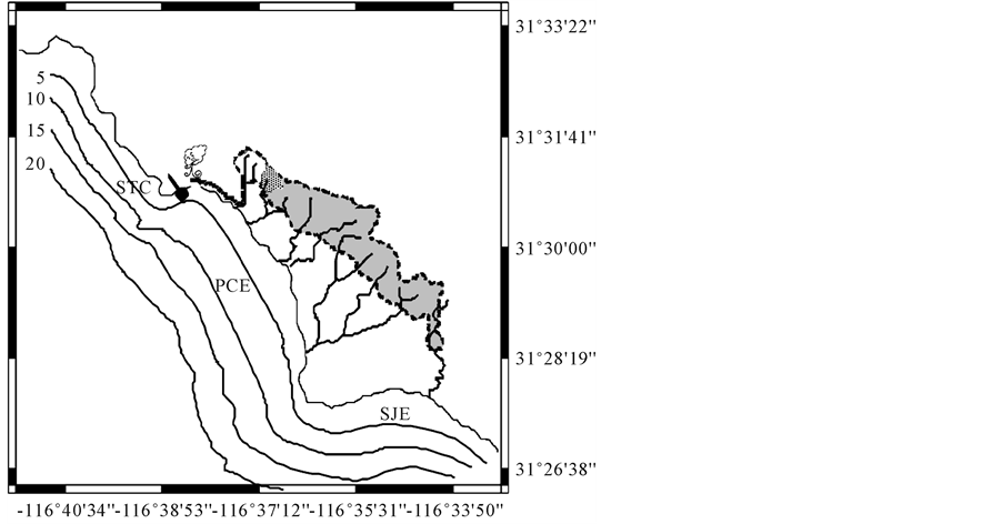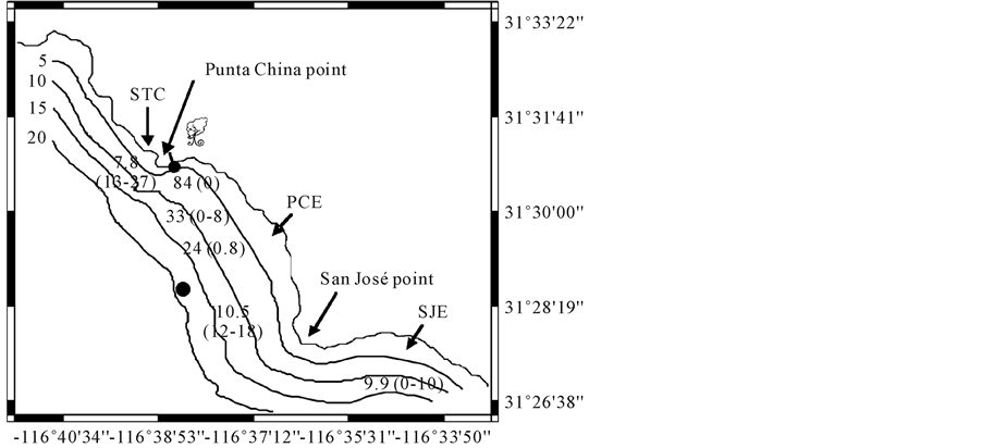 1993 by [4] : PCE at the center and two contrasting North and South sites (STC and SJE), comprising around 13 km coastline (0.63 for STC, 7.0 for PCE and 5.5 for SJE).