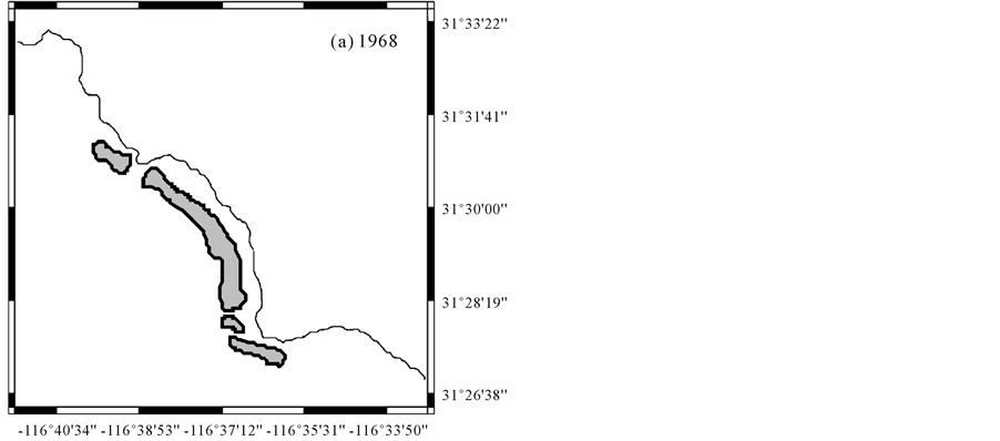 For the kelp forest, the following sources were employed: a 1968 aerial photograph from [6] ; a 1985 satellite image from [7] ; data of the 1993 bottom percent cover by M. pyrifera from [4] , a 2006 aerial image from INEGI, and a 2009 NOAA ASTER image. For the 1968 data, the surface borders of the kelp canopy were digitalized and their corresponding areas estimated using Google Earth Pro. For the 1993 data, range of bottom cover was set over kelp silhouettes mimicking the 1985 image.