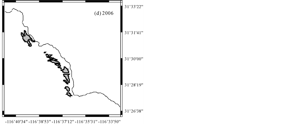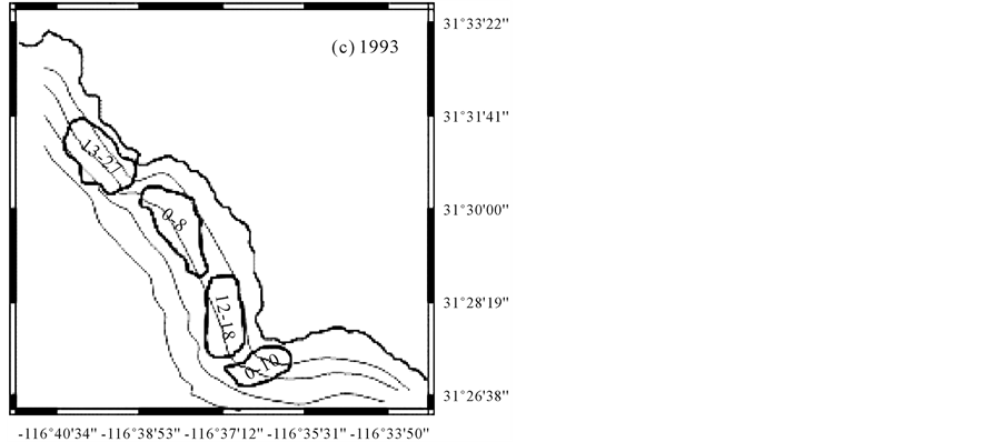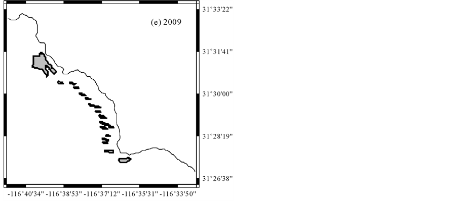 By 2006-09, the PCE kelp bed was very to extremely fragmented in 11 - 15 small and narrow patches, whereas that at STC was still continuous and the one at SJE was somehow reduced (Figure 6(d) and Figure 6(e)).