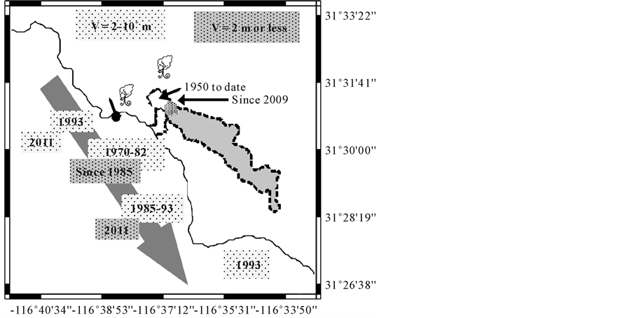 Figure 7. The gradient of visibility (V) along time at PCE and the contrasting conditions North and South (STC and SJE). Codes for visibility are operational and refer to the 2 m value as the critical level for safe diving. Gray arrow on back indicates prevailing circulation and advection process patterns. Limits of the original limestone bed and scope of extraction areas are as in Figure 5. Blowing face image and tip-rounded arrow are as in Figure 3. Source: this study.