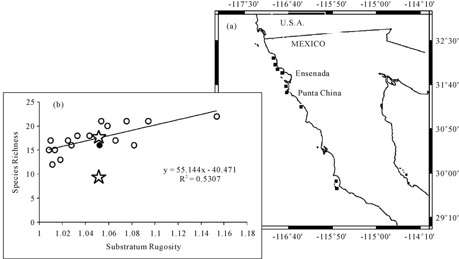 Figure 1. The area covered by the ten sites included in extensive kelp beds surveys (a) and the relationship between bottom rugosity and species richness (b). Observed and expected values at Punta China embayment are indicated by low and high stars respectively. Observed value at Santo Tomás cove is in full circle. Source: Torres-Moye et al., forthcoming.