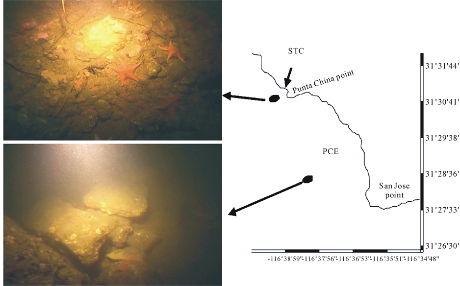 Figure 2. Seafloor conditions at Punta China embayment (PCE) and Santo Tomás cove (STC) showing high turbidity and almost bare bottom in the first, and good visibility and conspicuous bottom species in the second. Pictures were taken on August 12th, 2011 with only one hour difference (10:00 and 11:00 hrs. respectively). Source: original pictures by G. Torres- Moye.